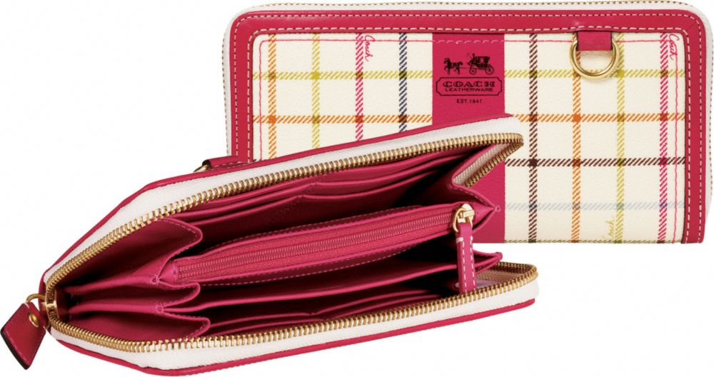 Coach Tattersall Zip Wallet and Coach Signature Print Scarf, both at Coach.com
